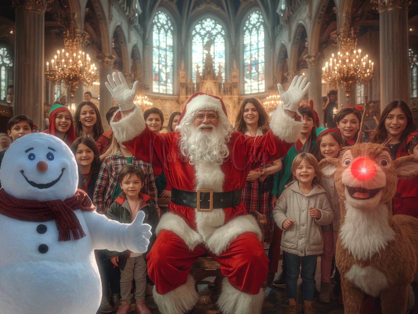 All the sudden his parents phased into physical form smiling as bright colorful lights popped on. Loud horns and whistles sounded with a dazzling light show just below the cathedral ceilings while confetti rained everywhere! Everyone popped up from behind pews while some ran out of confessionals and other rooms. Some even teleported in! Mrs. Claus and her kids appeared out of thin air beside Santa’s parents!
